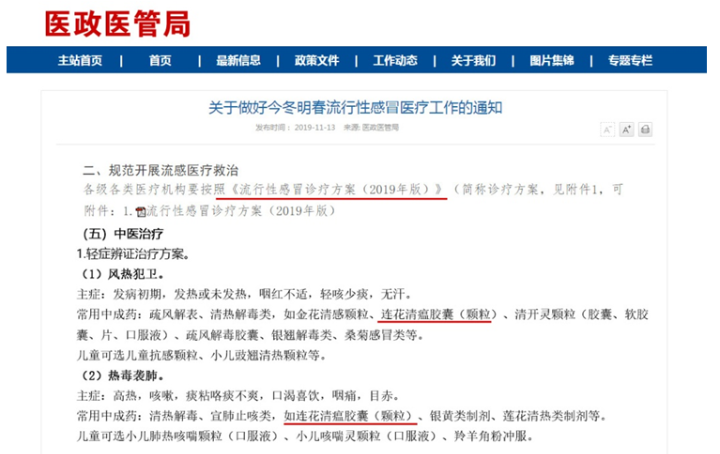 2019年11月13日,国家卫健委发布《流行性感冒诊疗方案(2019年版)》(下称方案),此方案对今冬明春流感的诊断和治疗,给出了权威建议。在《方案》推荐药品中,连花清瘟胶囊、颗粒等成为国家推荐治疗流感的有效中药。这是截至2019年,连花清瘟胶囊(颗粒) 第18次被国家卫健委、国家中医药管理局等部门列入治疗流感等呼吸道疾病的诊疗方案。