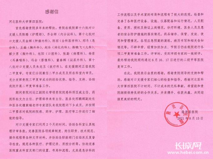 隆尧县医院致河北医科大学第四医院的感谢信。河北医科大学第四医院供图