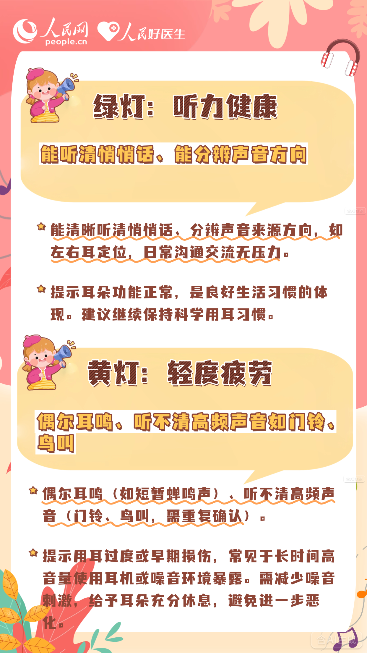 在日常生活中,耳朵如同精密的“声音雷达”,时刻捕捉着周围环境的万千旋律。然而,生活节奏的加快、工作压力的累积、用耳习惯的不当等因素,正悄然侵蚀着我们的听力健康。平时看似不起眼的“小状况”,可能是听力健康在悄悄“亮灯”。今天是“全国爱耳日”,不妨通过“红绿灯”自测法快速评估耳朵状态,及早识别风险,从而更好地守护听力健康。